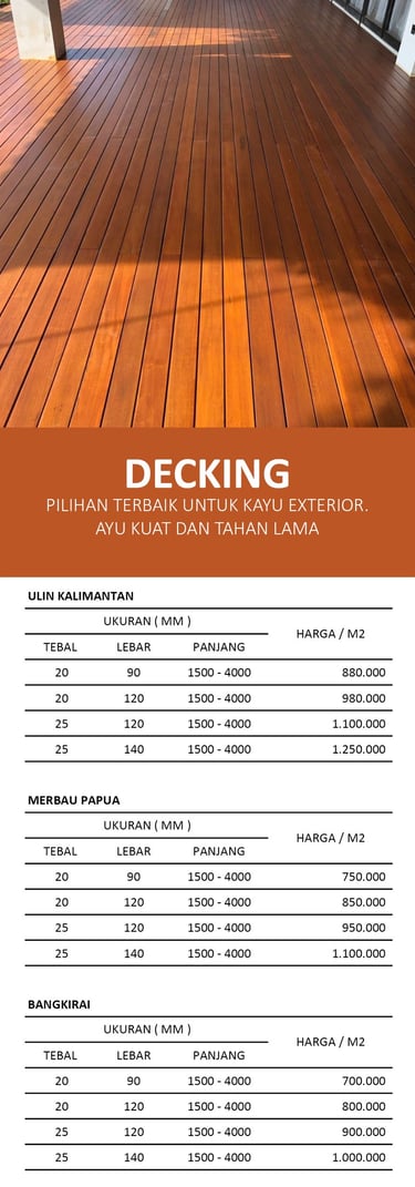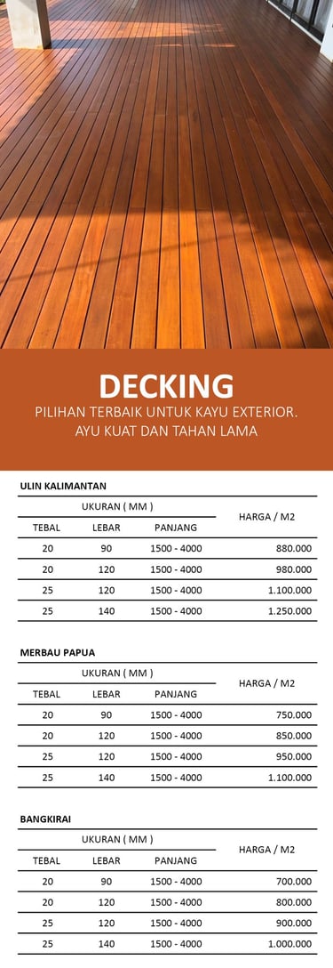 Tingkatkan keindahan ruangan dengan produk decking dan flooring kayu berkualitas tinggi.